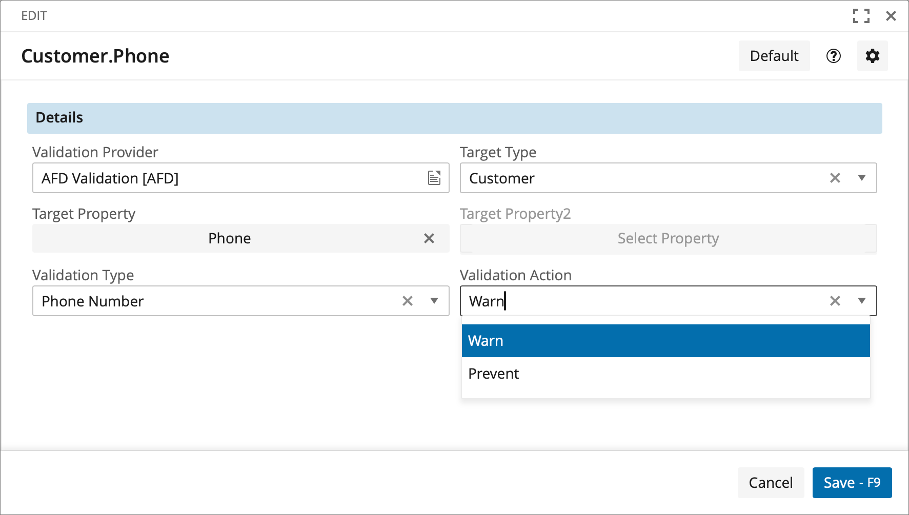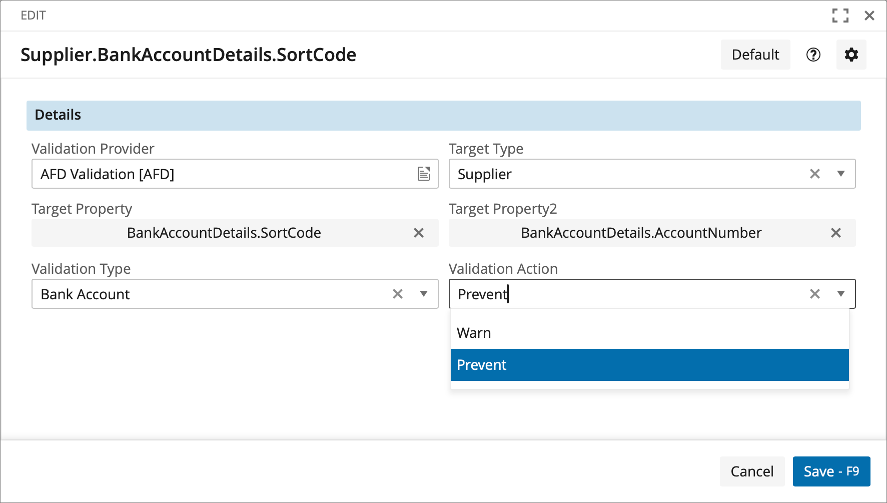 We support bank account validation. You can see here that we have to choose two properties that are validated together.