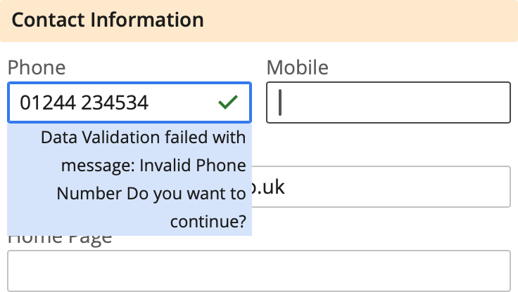In this case, we are showing a warning when an invalid phone number is entered.